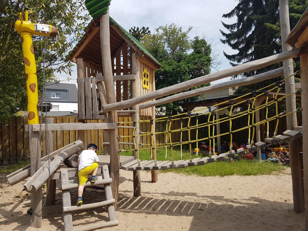 Durch Sandspielzeug, Bälle, Fahrzeuge und Wasser an heißen Tagen wird der Garten noch bereichert. Er bietet den Kindern genügend Platz, die Natur zu erleben und zu erkunden. Es stehen den Kindern ein Weiden- Tipi, ein Sandkasten, eine Fahrstrecke für Bobbycars, Laufräder u.ä. sowie eine Matschküche zur Verfügung. Außerdem ein Klettergerüst mit geeigneter Rutsche sowie einer Hängebrücke und seit 2025 einer neuen Schaukel und Wippe.