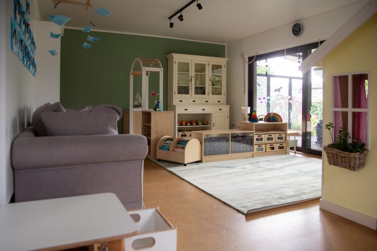 Zentraler Punkt des Hauses ist das Wohnzimmer. Hier beginnt der Tag mit dem Morgenkreis. Der Raum ist in einzelne Spielbereiche unterteilt, hier findet ein Großteil des Freispiels statt. Es gibt beispielsweise eine Bauecke, ein Rollenspielbereich, einen Spielteppich und eine Leseecke.